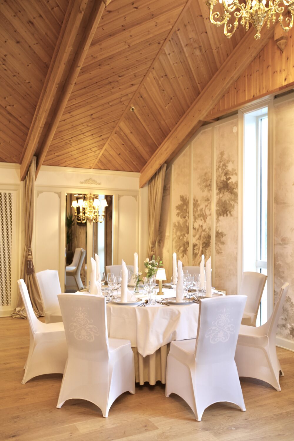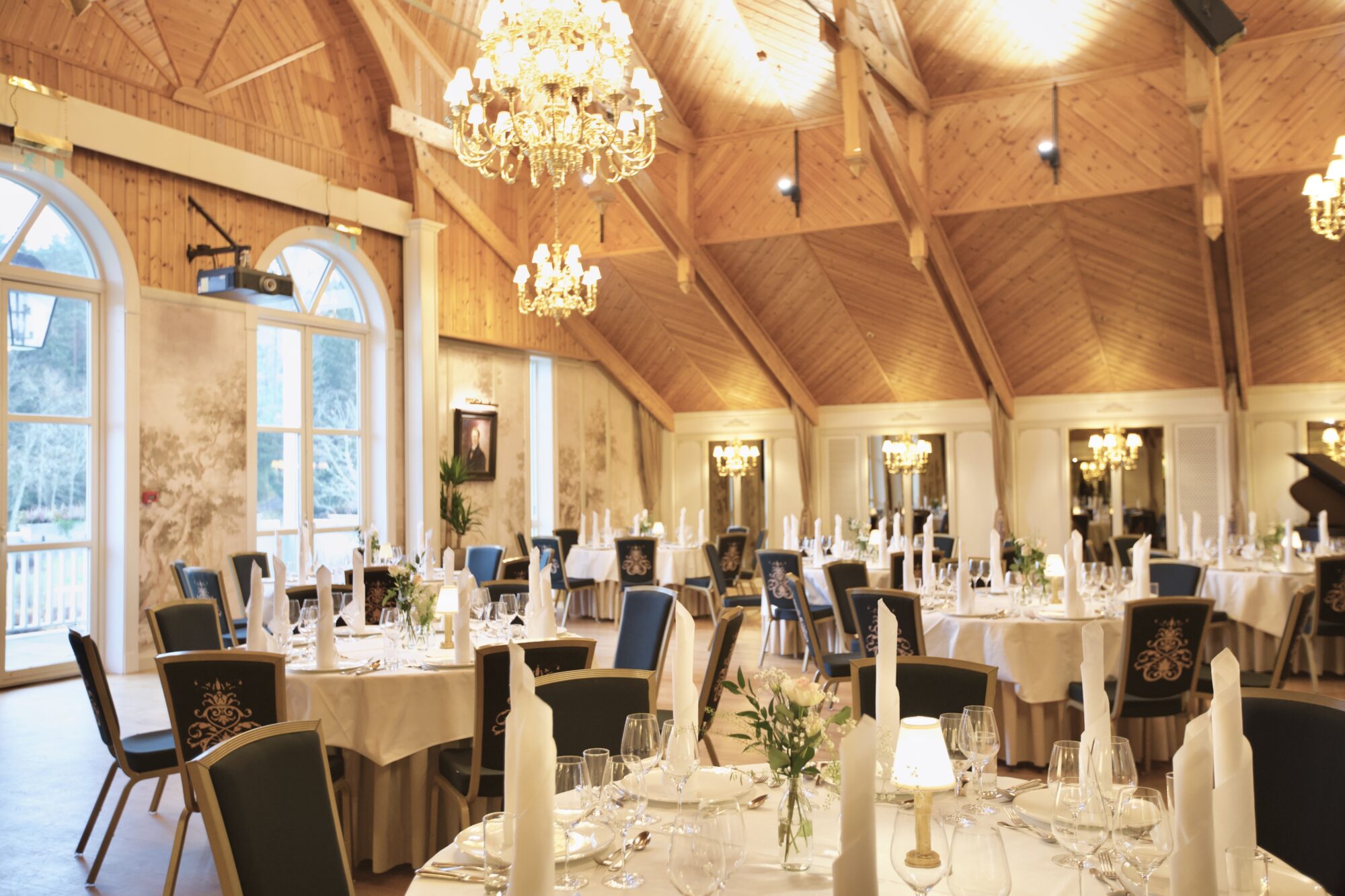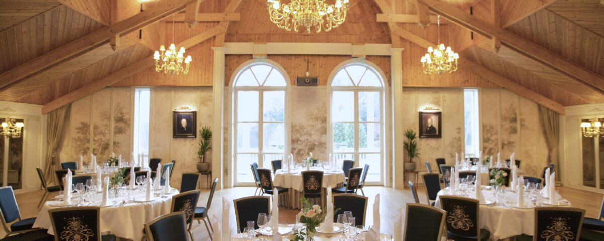 Dette er en stor majestetisk sal i 2 etg. i vår nye del, taket er buet og maxhøyde er 8 meter opp til møne, hvor massive lysekroner pryder taket, denne salen har kapasitet for inntil 140 spisende gjester, og her disponerer dere tilhørende salonger utenfor salen før og etter middag.